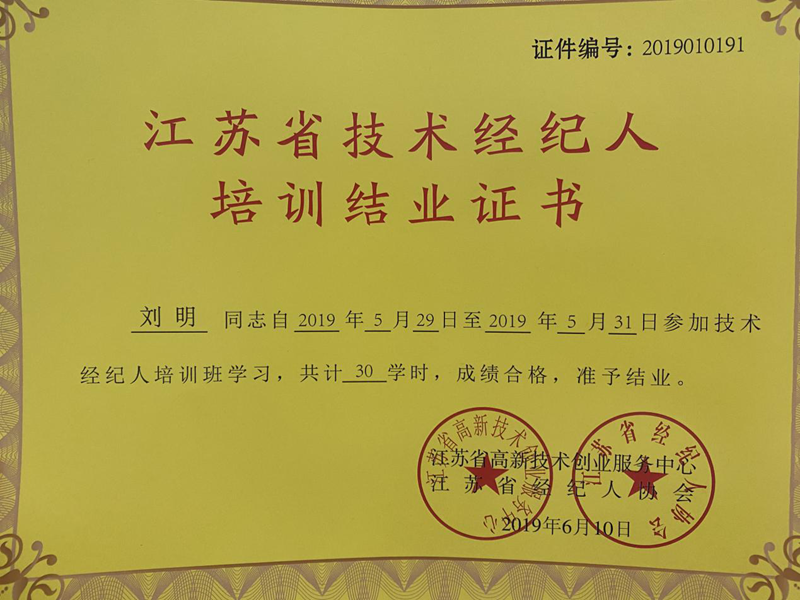 為提高公司服務(wù)質(zhì)量、豐富公司人才類型,美多利公司組織員工參加了江蘇省經(jīng)濟(jì)技術(shù)經(jīng)紀(jì)人培訓(xùn)課程并獲得了培訓(xùn)結(jié)業(yè)證書(shū)。